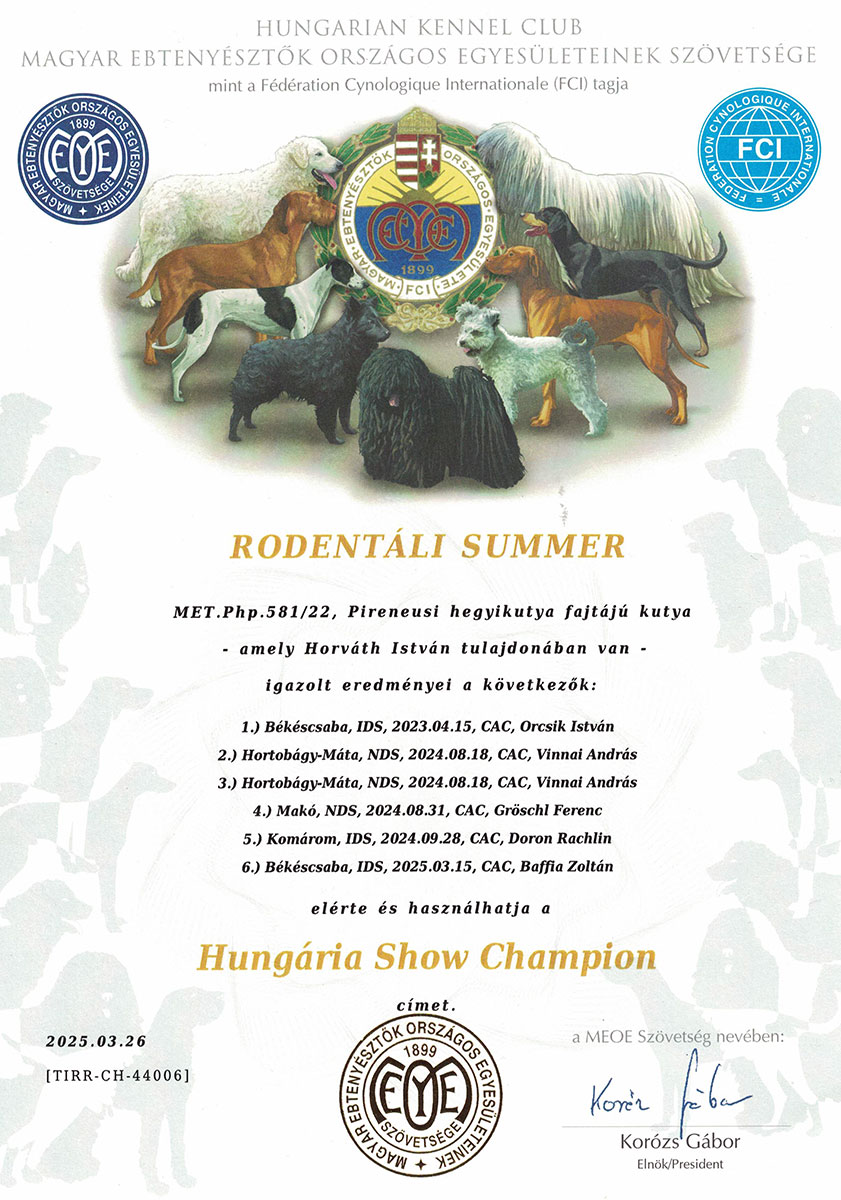 | 2022.09.04. | Hajdúdorog CACIB | Nagyon ígéretes / Very promising / Best Puppy | Denk Csaba |